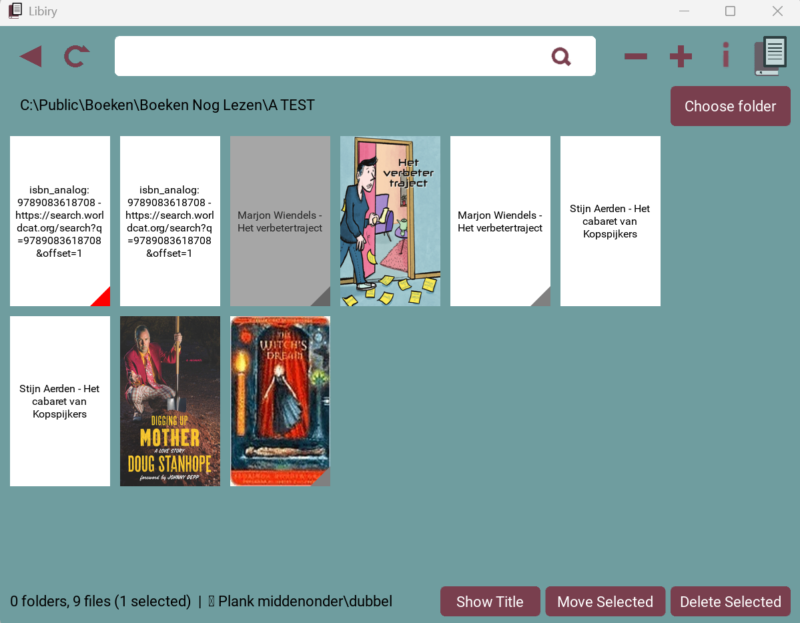 Hier zie je een beetje wat het gaat worden. De twin-knop rechtsboven is ingedrukt, en daarom worden alleen de boeken die mogelijk dubbel zijn getoond. De covers met een rood driehoekje erop horen bij samenvattingen, die met een grijs driehoekje bij analoge boeken. Het derde boek is geselecteerd (en daardoor uitgegrijsd). Met de knoppen rechtsonder kan dit boek verplaatst of verwijderd worden.