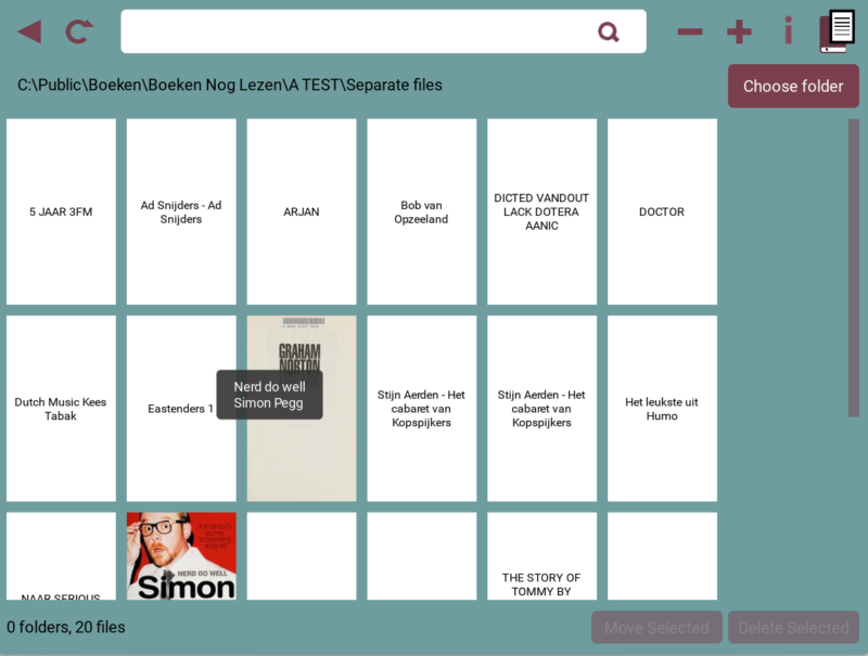 Mijn eerste idee was dat alle analoge boeken 2 ISBN-codes zouden krijgen. Het programma zou de ISBN van de digitale twin bijlezen, en dat zou de basis zijn waarop dubbele boeken gevonden gingen worden. Later bleek dat titel plus auteur veel beter werkte. Toen kon die logica er weer uit. Verder begon ik met een up-, back- en forward-knop en zaten er ook nog 3 verschillende popups in waarmee je naar een andere folder kon gaan. De shortcuts zijn er nog, maar de knoppen zijn verdwenen.