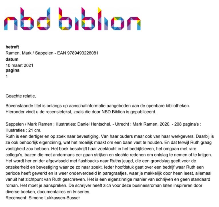 ‘Ik las de drukproef. (…) In 2020 schreef Marjon Wiendels de roman Sappelen, destijds gepubliceerd onder de naam Mark Ramen. Die heb ik ook gelezen en vond ik erg goed.’