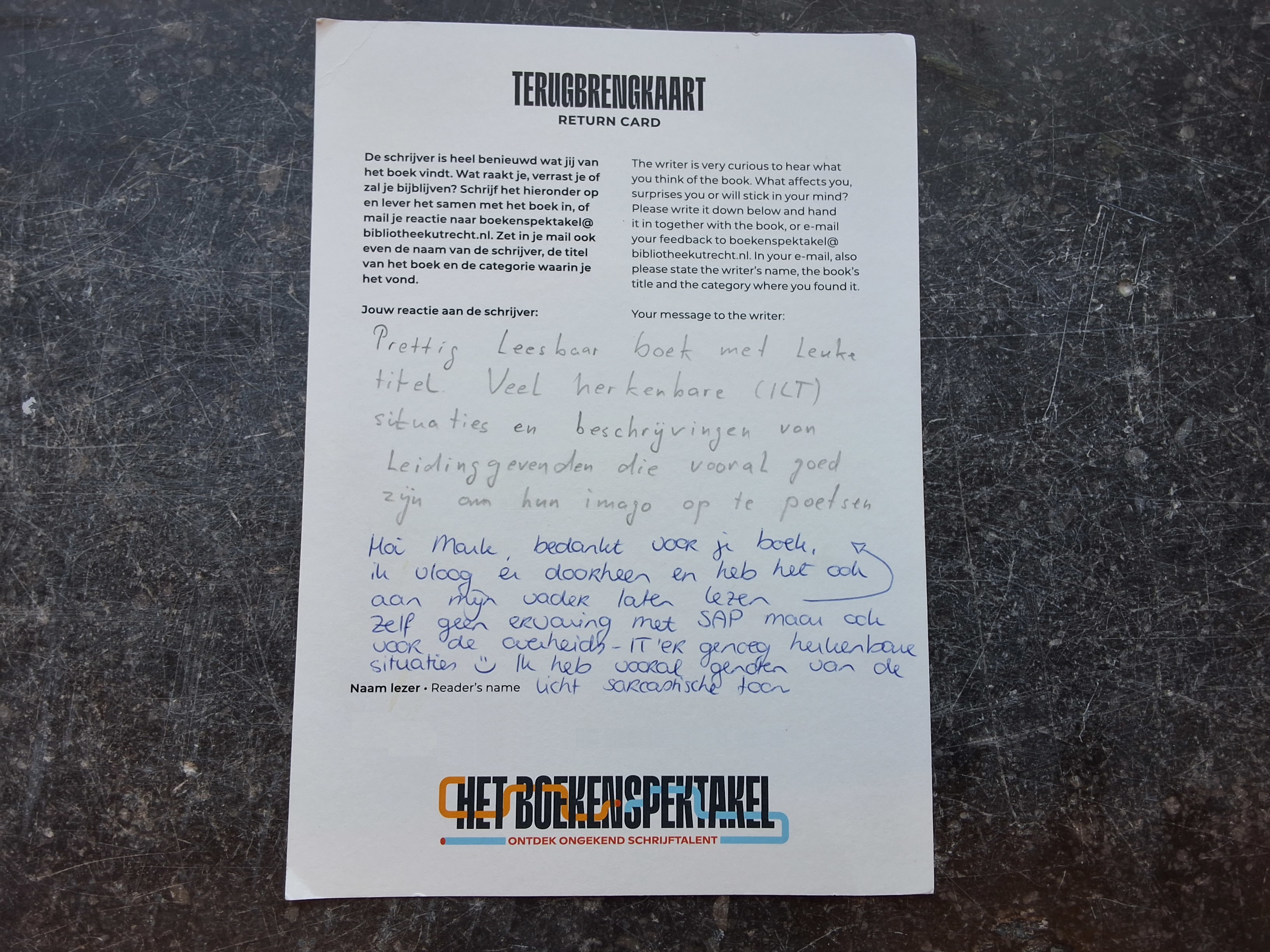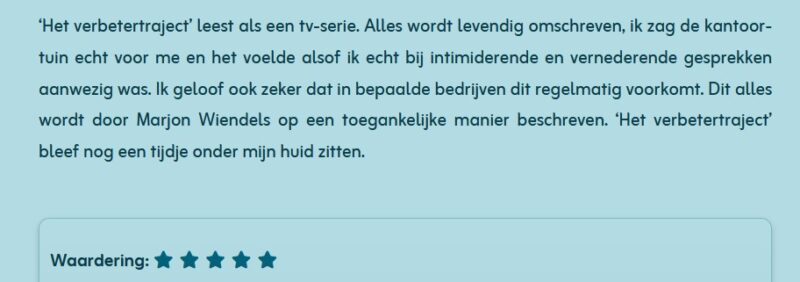 ‘Echt een beknellend verhaal om te lezen. Toch las het fijn weg, net als je vorige boek. Ik kan me voorstellen dat lotgenoten dit graag zouden lezen. Goed gedaan!’